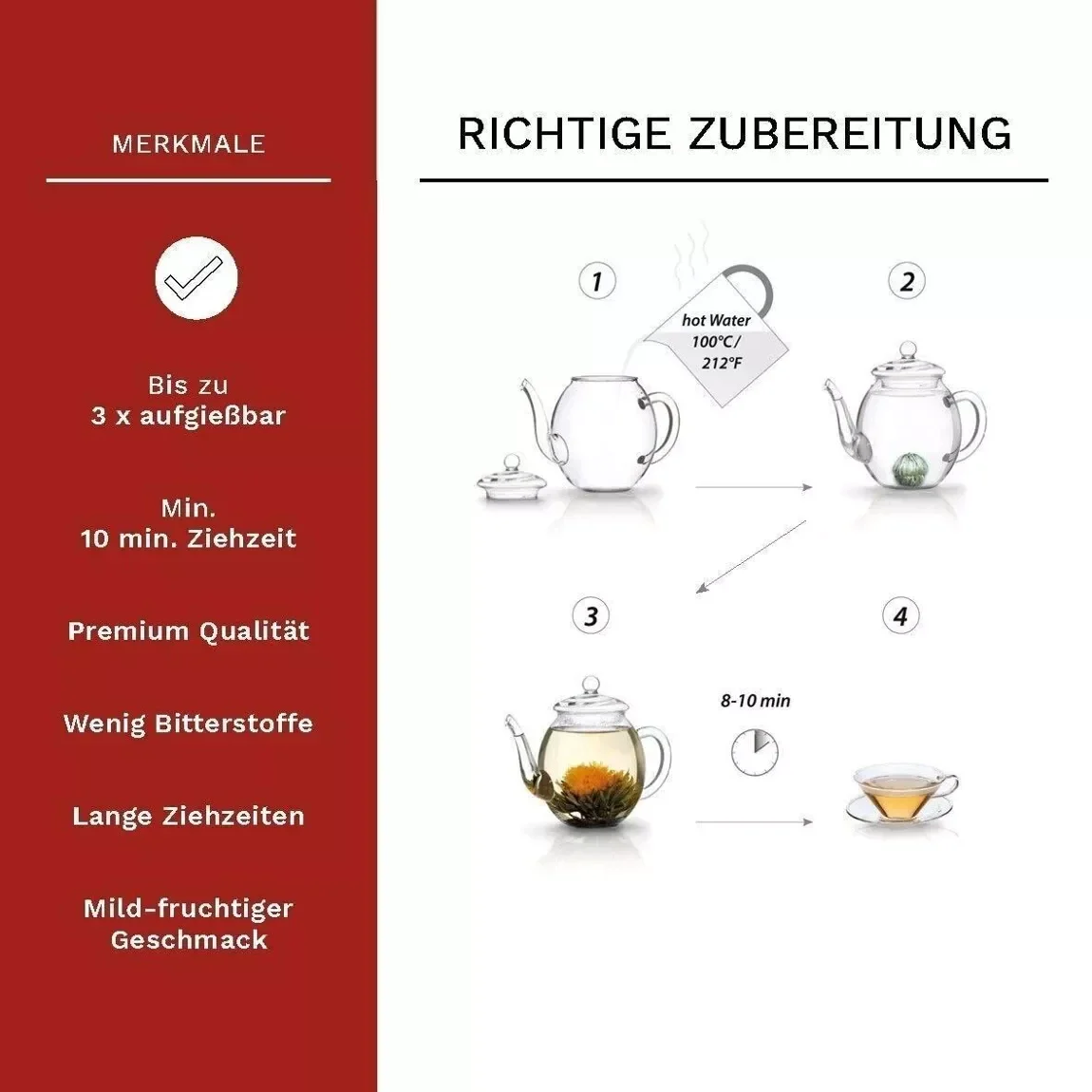 Placera en teblomma i en glastekanna eller kopp. Häll ca 80–90°C varmt vatten över och njut av hur blomman sakta vecklar ut sig. Låt dra i 5–10 minuter.