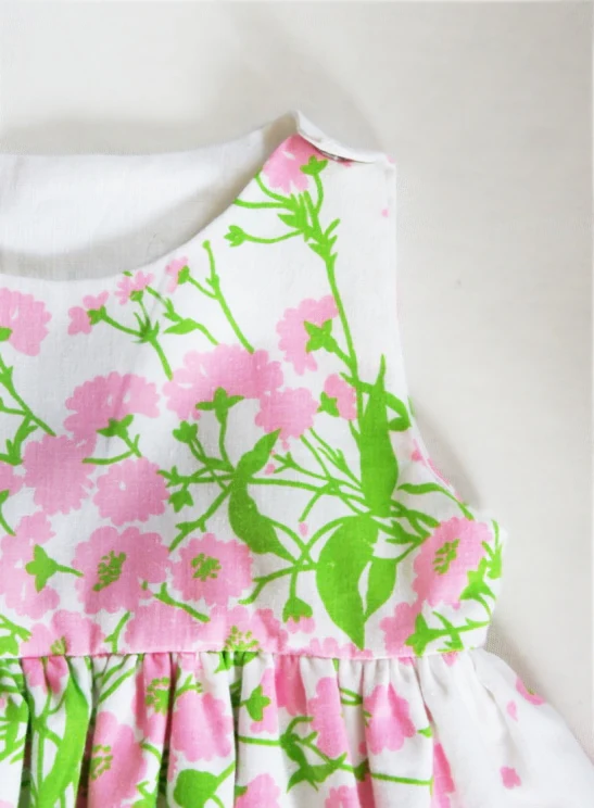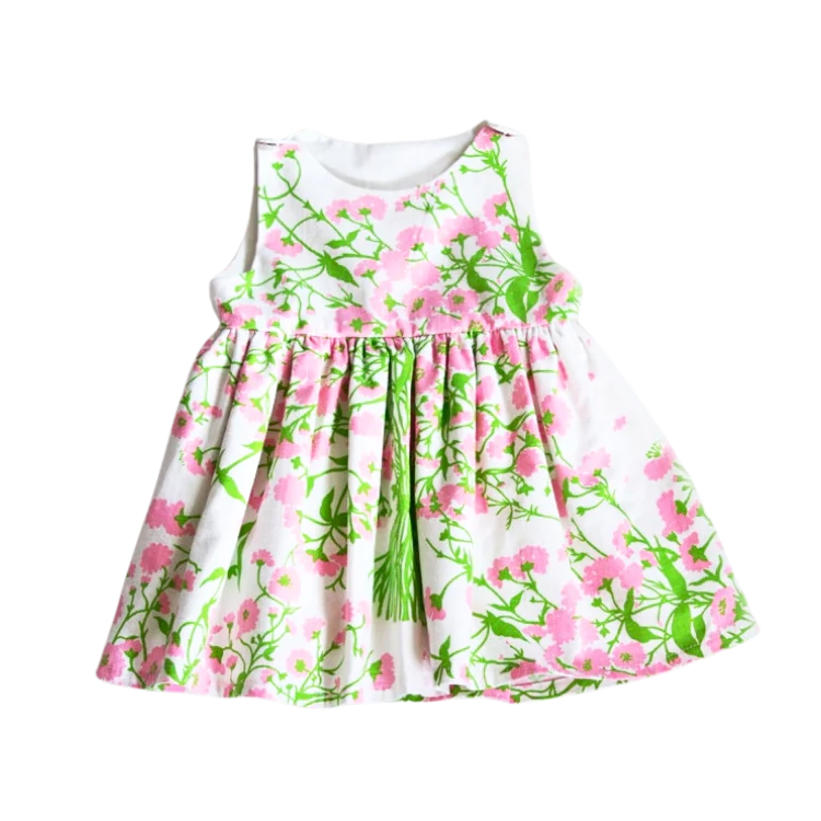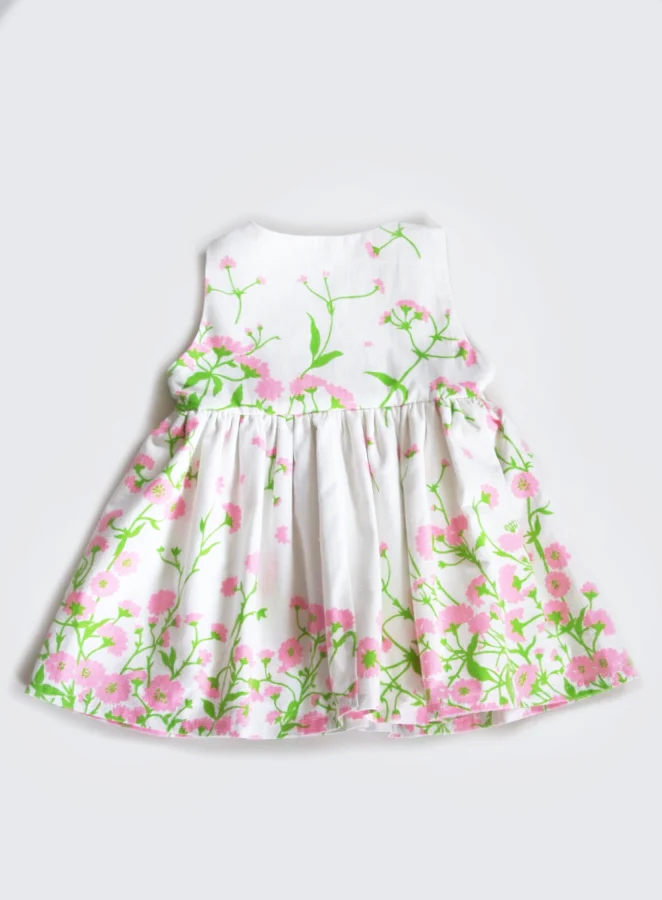 - Klänningen pryds av blommor i rosa och grönt på vit botten.