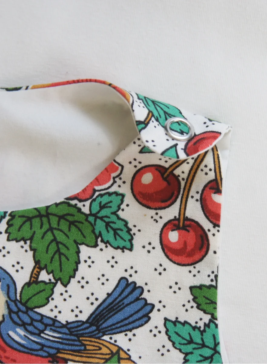 - Klänningen pryds av fåglar, blommor och blad i rött, grönt, blått och gult på vit botten.