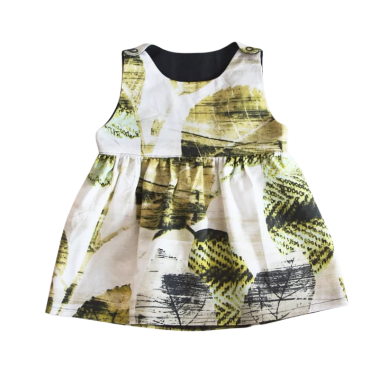 Det här exemplaret är sytt i ett tyg med löv i gröt och svart på vit botten. Ett mjukt och vackert tyg som fått nytt liv som favoritplagg i garderoben.