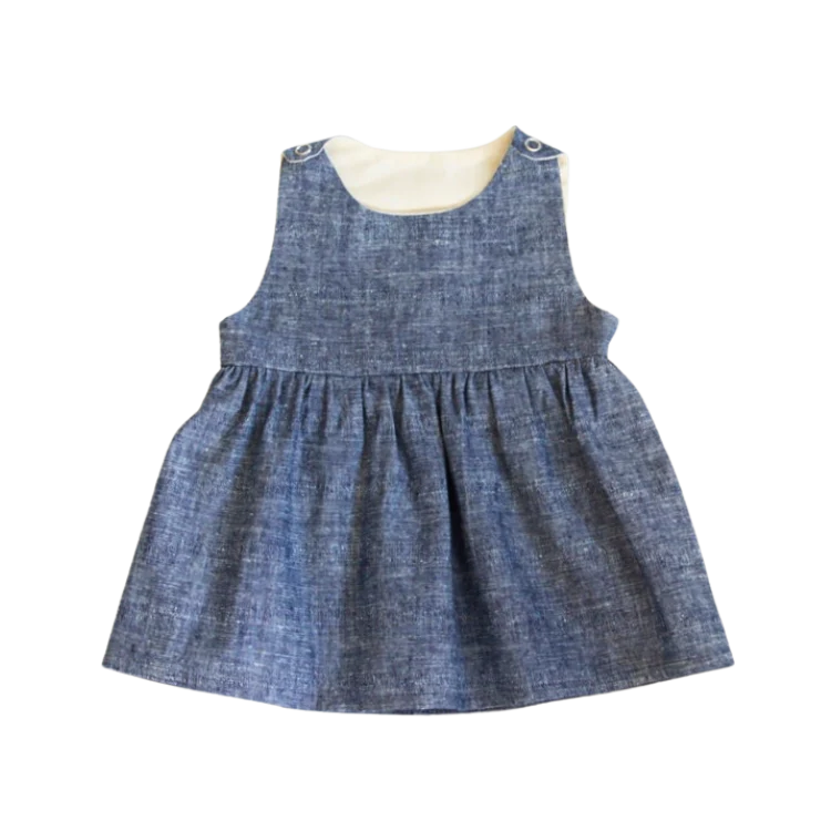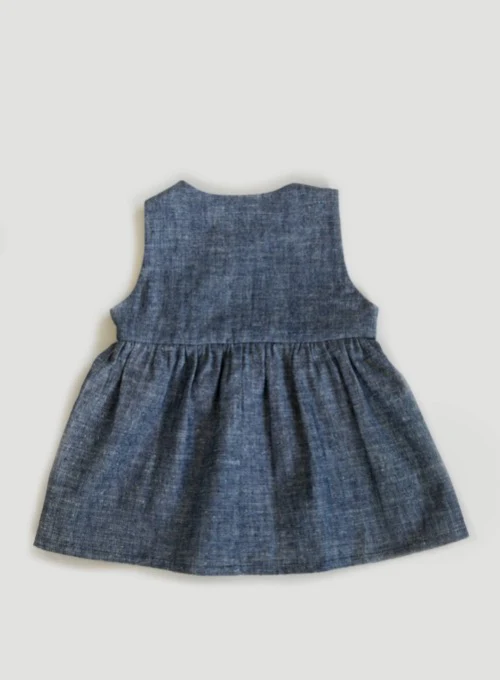 En ljuvlig barnklänning i klassisk modell med rynkad kjol och skärning i midjan. Den är tillverkad av ett denimblått tyg av hampa och ekologisk bomull. Klänningen sys upp på beställning i By Lelous ateljé och leveransen kan därför ta några dagar extra.