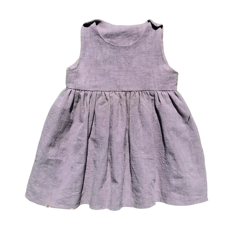 En stilren och tidlös klänning sydd i ett vackert återbrukat linnetyg. Modellen är klassisk med skärning i midjan, rynkad kjol och tryckknappar på axlarna. Lätt att ta av och på även på små barn.