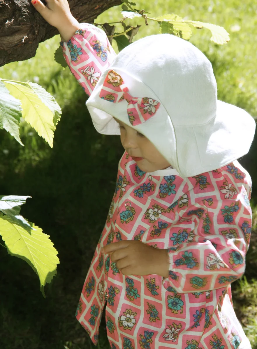 - Vit botten med rosa rutor, blommor i blått och vitt.
