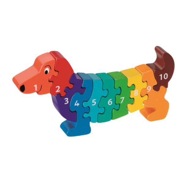 Ett pedagogiskt 1–10-pussel i trä med en färgglad tax som hjälper barn att på ett lekfullt sätt öva på siffror och räkning. Pusslet består av tio rejäla träbitar som är enkla att greppa för små händer och som tillsammans bildar en hund.