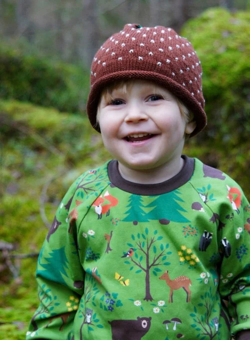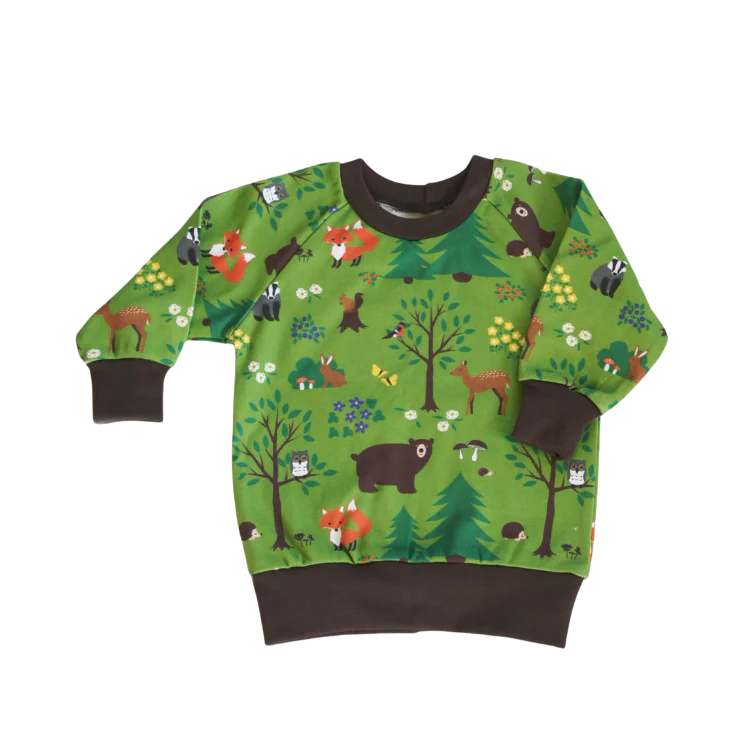 Tröja i collegemodell tillverkad av By Lelou i ett mjuk, ekologisk collegetyg med tryck med skogsdjur designat av By Lelou.