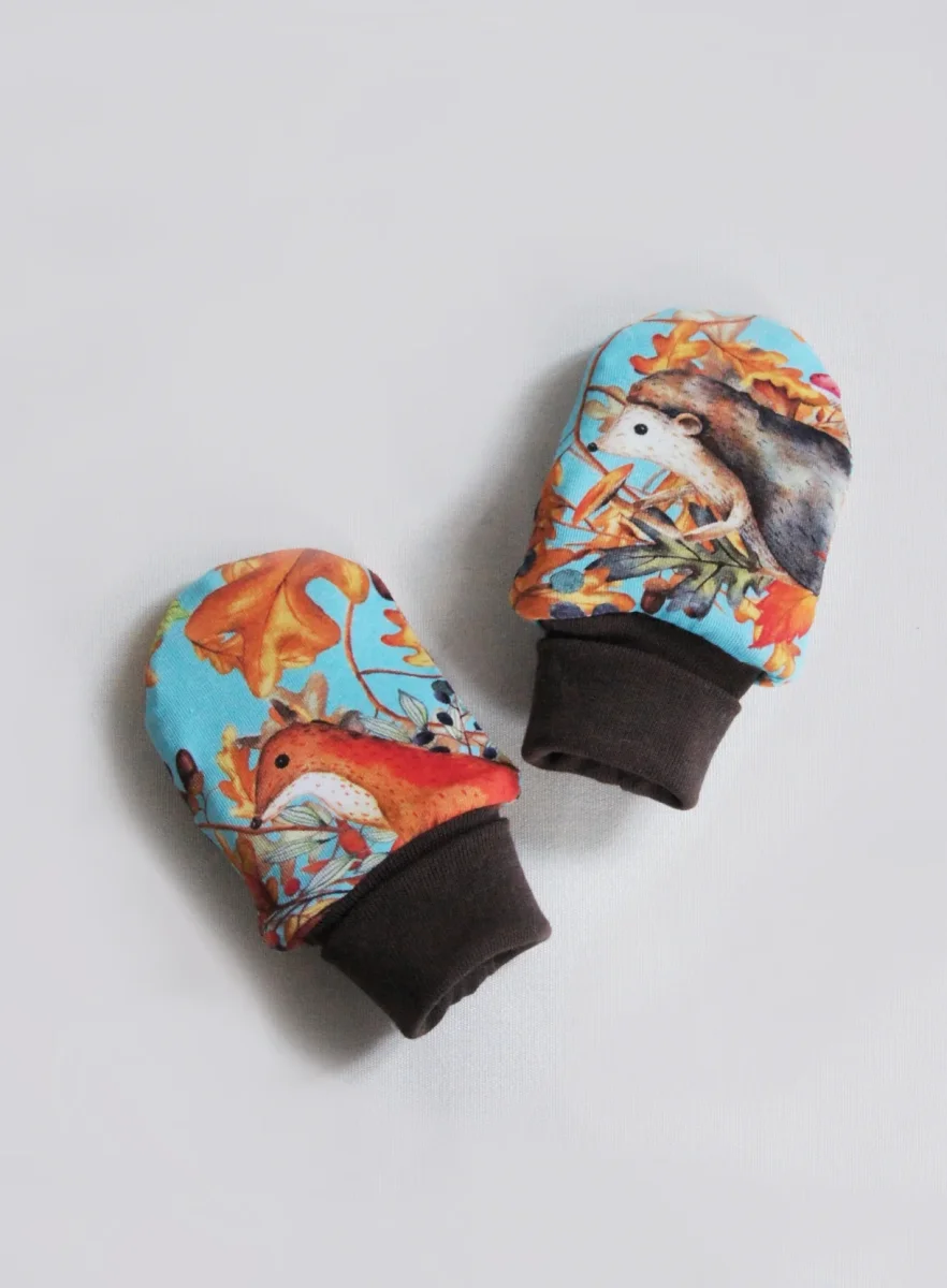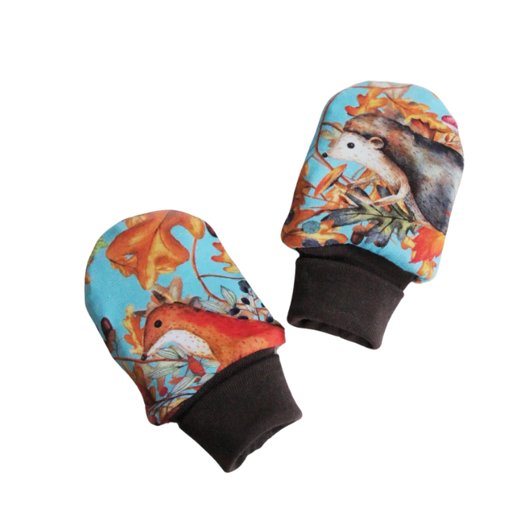 - Rävar, ekorrar, igelkottar och ugglor, blad, ekollon och svampar i orange, vitt, beige, brunt, rött och grönt på turkos botten.